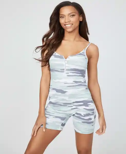 Modelo: Q2GD01KARG1. Enterito de Mujer Con Tirantes y Largo Sobre Las Rodillas. Diseño Ajustado Con Estampado de Camuflaje Con Cierre de Cremallera en Parte Frontal y Tipografía de Letras Guess en Pierna Izquierda. Materiales: 5% Elastano Spandex 95% Cotton.
