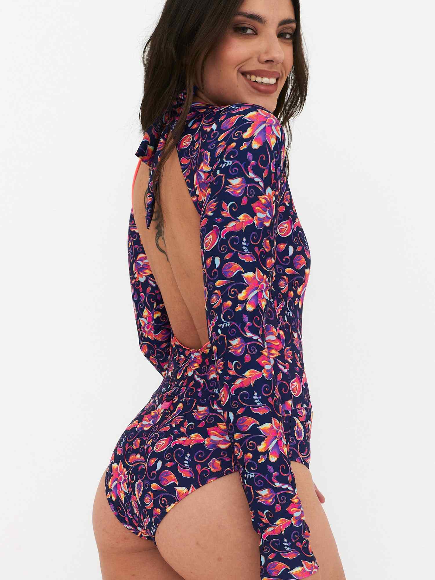Tipo: Traje de Baño Daikiri de Una Pieza con Manga LargaTela: Estampado Floral en MulticolorParte de Arriba: Tipo Halter, con Amarras Ajustables y con opción de poner almohadillasParte de Abajo: Tipo ClásicoDestaca: Marga Larga para mayor proteccion del Sol