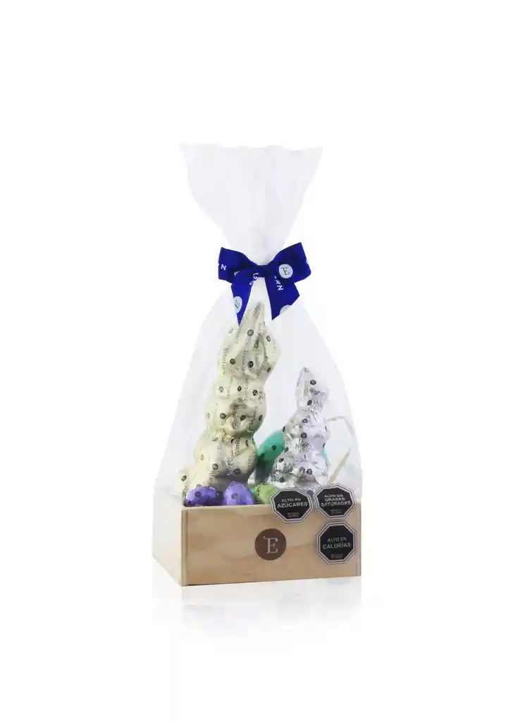Canasta de madera que contiene: 1 Cajas de lápices de chocolate, leche, blanco y bitter 50 g. 1 Caja de Legos de chocolate leche 139 gr. c/u.