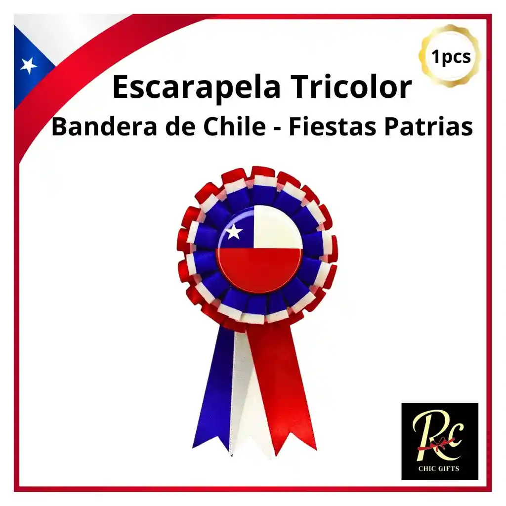 "Celebra con orgullo y estilo las Fiestas Patrias con esta elegante escarapela tricolor de Regalos Chic. Perfecta para adornar tu ropa o la de tus hijos en cualquier celebración, desfile o acto cívico. Su vibrante diseño con la bandera de Chile es ideal para complementar tu vestuario dieciochero. ¡Compra esta cucarda dieciochera de alta calidad y luce tu espíritu patriota! Escarapela de bandera chilena, roseta fiestas patrias, accesorio 18 de septiembre, broche tricolor, distintivo patrio. Demuestra tu orgullo con un pequeño detalle que lo dice todo. Esta escarapela es el accesorio perfecto para llevar la pasión por tu país en el corazón, o mejor dicho, ¡en el pecho! Beneficios que te Harán Lucir con Orgullo: Símbolo de la Chilenidad: Un distintivo clásico y elegante que muestra tu amor por la patria. Fácil de Colocar: Cuenta con un práctico ganchito en la parte posterior para sujetarla de forma segura en camisas, blusas, vestidos o chaquetas. Diseño Vibrante y Duradero: Fabricada con cinta de raso de alta calidad y un botón con los colores de la bandera, asegurando que se vea perfecta durante toda la celebración. Tamaño Ideal: Con 15 cm de largo y 7.5 cm de ancho, es lo suficientemente visible para destacar sin ser incómoda. Para Todas las Edades: Perfecta tanto para niños en actos escolares como para adultos en reuniones y celebraciones. Complemento Esencial: El toque final para cualquier atuendo dieciochero, desde disfraces de huaso y china hasta ropa casual. Características que la Hacen Única y Elegante: Dimensiones: 15 cm de largo y 7.5 cm de ancho. Materiales: Cinta de raso y botón de plástico de alta calidad. Ganchito Posterior: Para una sujeción segura y fácil. Diseño Tricolor: Representa la bandera de forma clásica y vistosa. Pack por Unidad: Se vende por unidad, ideal para comprar la cantidad que necesites. Escarapela bandera de Chile Cucarda Fiestas Patrias Roseta dieciochera Broche bandera chilena Accesorio 18 de septiembre Adorno patrio Distintivo bandera Chile Regalos Chic Escarapela Lazo tricolor Pin Fiestas Patrias ¡No dejes que tu vestuario dieciochero se quede sin este toque de orgullo! Consigue tu escarapela tricolor en Regalos Chic y prepárate para celebrar el 18 de septiembre con todo el corazón."