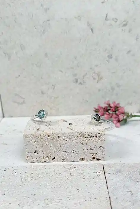 Esclava 100% de plata pura, elaborada a mano por talentosos orfebres chilenos. Su diseño presenta dos piedras semipreciosas: una aguamarina en un extremo y un peridoto en el otro, ambas engastadas cuidadosamente en bisel para resaltar su brillo natural. Cada pieza es única y transmite la esencia de la joyería artesanal, ideal para quienes buscan elegancia y estilo en sus accesorios.