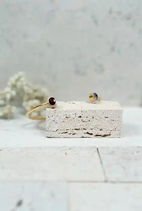 Esclava de cobre con doble baño de oro amarillo de 18K, elaborada a mano por talentosos orfebres chilenos. Su diseño presenta dos piedras semipreciosas: un granate en un extremo y una aguamarina en el otro, ambas engastadas cuidadosamente en bisel para resaltar su brillo natural. Cada pieza es única y transmite la esencia de la joyería artesanal, ideal para quienes buscan elegancia y estilo en sus accesorios.