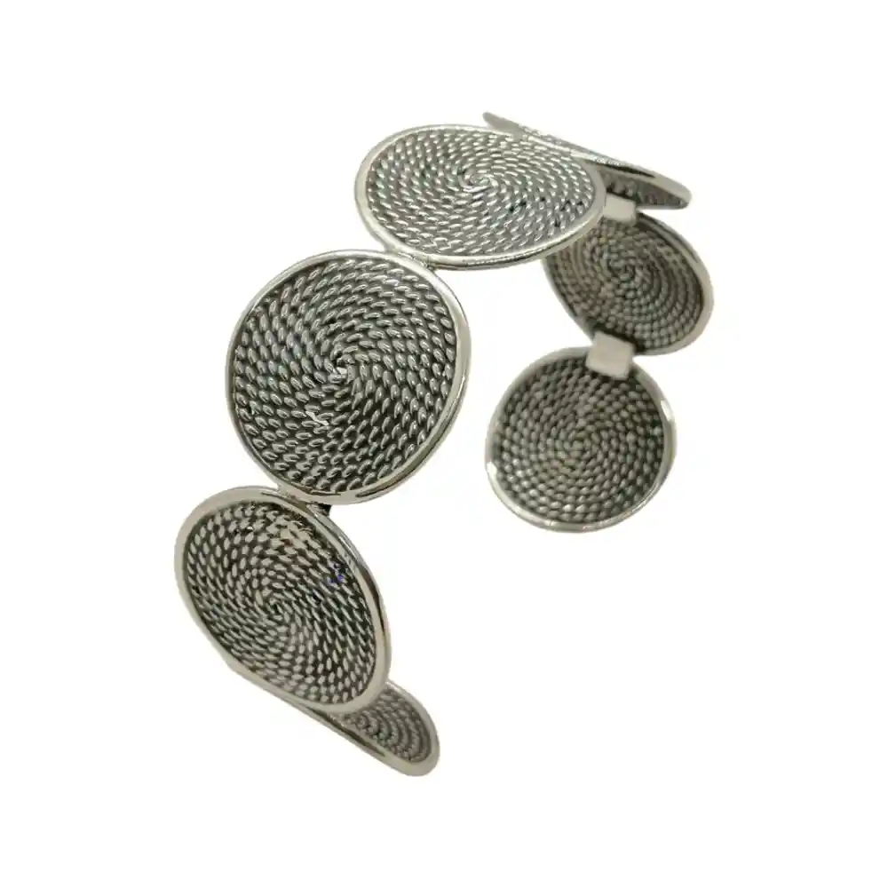 Hecha a mano en plata 950. Dimensiones: 2,1 cms de diámetro cada círculo. Ajustable.