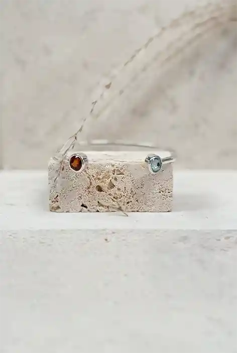 Esclava 100% de plata pura, elaborada a mano por talentosos orfebres chilenos. Su diseño presenta dos piedras semipreciosas: un granate en un extremo y una aguamarina en el otro, ambas engastadas cuidadosamente en bisel para resaltar su brillo natural. Cada pieza es única y transmite la esencia de la joyería artesanal, ideal para quienes buscan elegancia y estilo en sus accesorios.