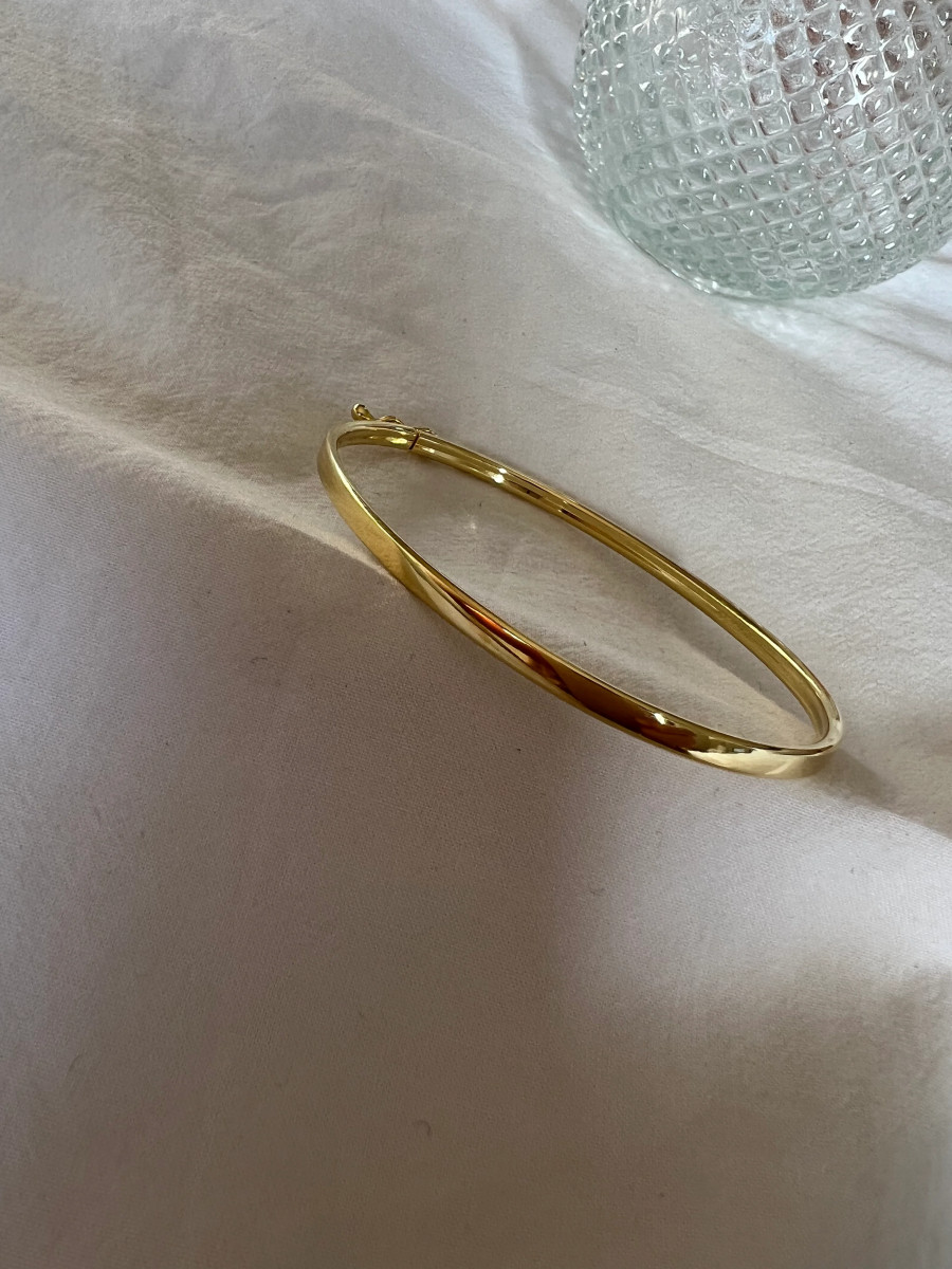 Preciosa esclava lisa con corte recto y ovalada (6.5x50x 4mm). Es de bronce enchapada en oro 18K libre de níquel. Hipoalergénica.b