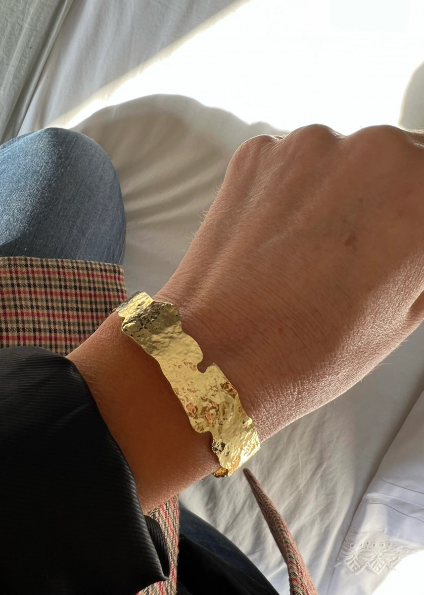 Definitivamente esta es una esclava que se ve bien con todo, puedes usarla de día y de noche. Es ajustable, 1 cm de ancho y terminación machacada-irregular.Es de bronce enchapada en oro 18 kilates o plata, líbre de níquel e hipoalergénic