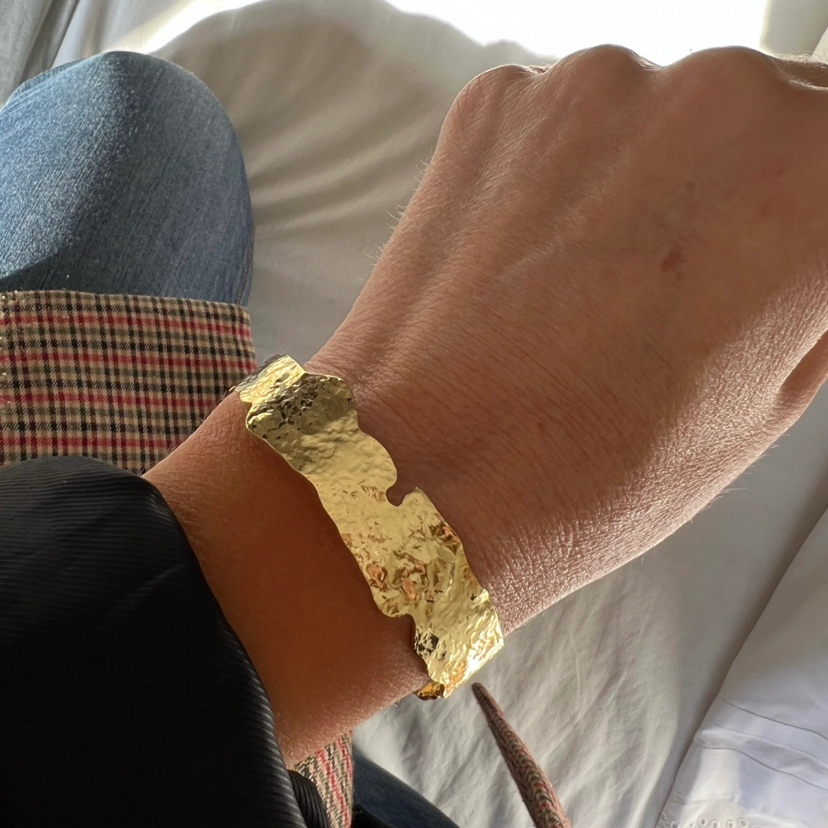 Definitivamente esta es una esclava que se ve bien con todo, puedes usarla de día y de noche. Es ajustable, 1 cm de ancho y terminación machacada-irregular.Es de bronce enchapada en oro 18 kilates o plata, líbre de níquel e hipoalergénic