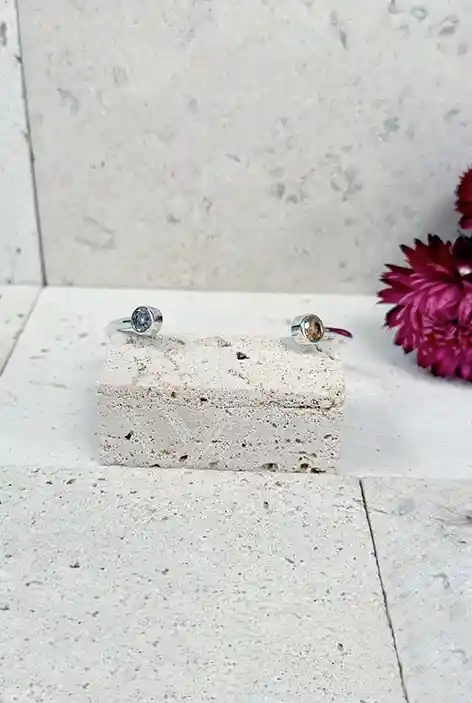 Esclava 100% de plata pura, elaborada a mano por talentosos orfebres chilenos. Su diseño presenta dos piedras semipreciosas: una aguamarina en un extremo y un citrino en el otro, ambas engastadas cuidadosamente en bisel para resaltar su brillo natural. Cada pieza es única y transmite la esencia de la joyería artesanal, ideal para quienes buscan elegancia y estilo en sus accesorios.