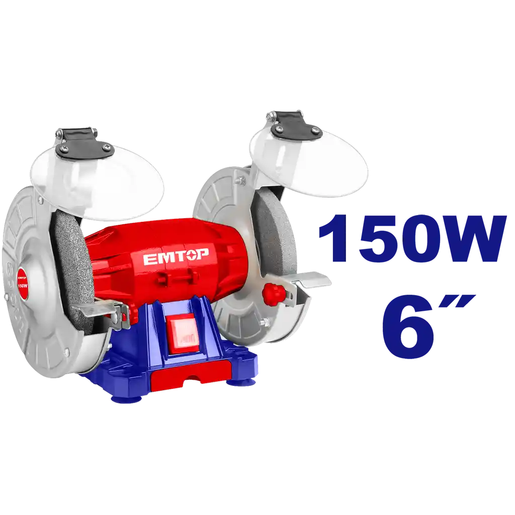 Voltaje: 220-240 V ~ 50 Hz Potencia: 150 W Velocidad sin carga: 2950 rpm Tamaño de la rueda: 150 mm (6”) Base de aluminio resistente Soporte de trabajo ajustable Incluye: 1 protector de ojos 1 caja de herramientas Embalado en caja de cartón