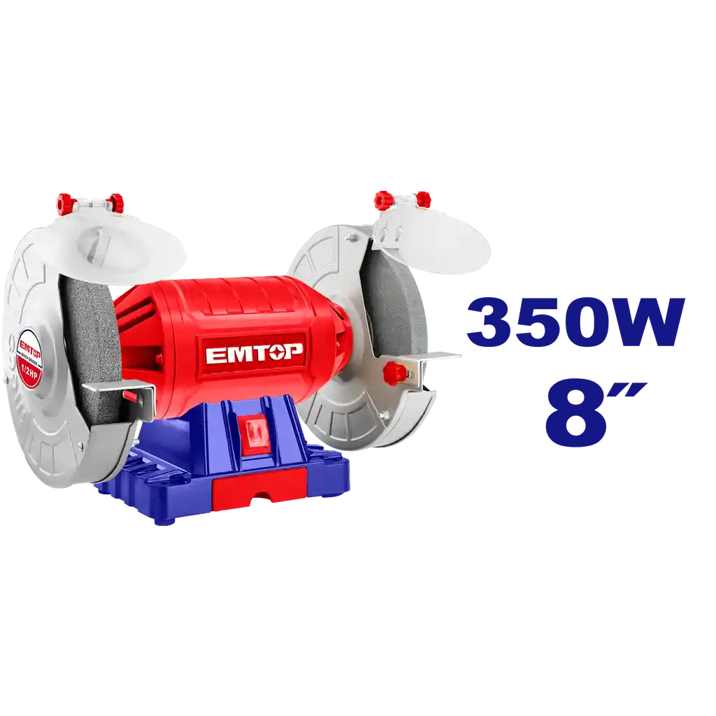 Voltaje: 220-240V ~ 50Hz potencia de entrada: 350W velocidad sin carga: 2950rpm Tamaño de la rueda: 200 mm (8" ) Heavy Duty Base de aluminio Ajustable de apoyo de trabajo Incluyendo 1 protector de ojos conjunto 1pcs caja de almacenamiento de herramientas Embalado por la caja de cartón