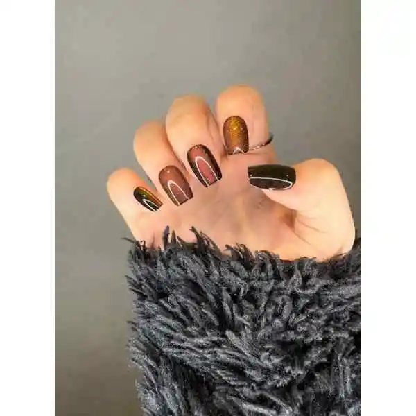 Tonos chocolate oscuro con efecto glaseado y shimmer dorado. Forma: Cuadrada Mediana, Talla: Standard Kit Incluye: 24 uñas, 24 stickers, lima, palo de cuticula, alcohol pad. 100% veganas, libres de crueldad animal, listas en 10min y duran hasta 2 semanas.