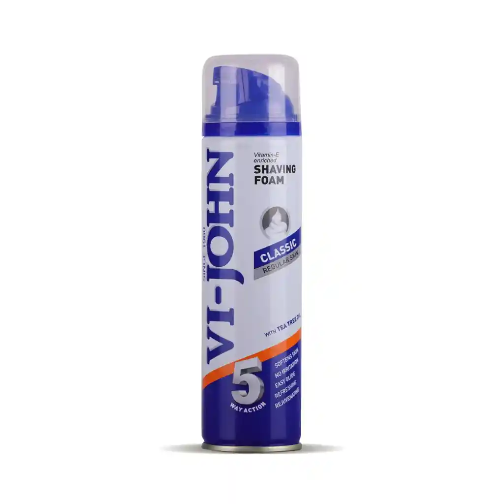 Espuma de Afeitar VI-JOHN 5 en 1 con Vitamina E Clásica para Piel Normal.Su rica fórmula tipo mantequilla con efecto refrescante ayuda a calmar y suavizar el vello facial, facilitando una experiencia de afeitado suave. Olvídate de los cortes, rasguños o enrojecimiento con esta excelente crema de afeitar, enriquecida con aceite de árbol de té y vitamina E. La vitamina E ayuda a mantener la hidratación de la piel, protege las células del daño y suaviza la piel, mientras que el aceite de árbol de té calma la piel y reduce el enrojecimiento después del afeitado. Su suave y fresca fragancia te mantendrá con una sensación de frescura durante todo el día. Ingredientes: Vitamina E Mentol Aceite de árbol de té