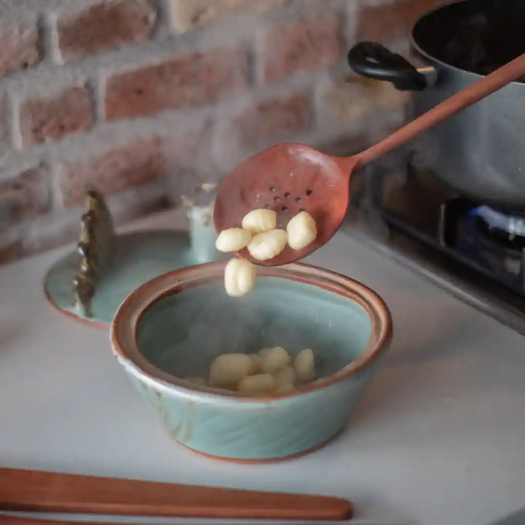 Las cucharas de madera volvieron en gloria y majestad, aunque en realidad nunca se hayan ido de nuestras casas y cocinas. Ahora vienen en todas formas, tamaños, colores y usos, pero mantienen su noble factura manual, su cuerpo de madera, su corazón sencillo y afable. Son tan lindas que te pondrás a coleccionarlas como una familia grande que llenará tu cocina de espíritu. Esta linda espumadera mide 35 cm de largo, 1,5 cm de alto y tiene 9,5 cm en su ancho mayor.