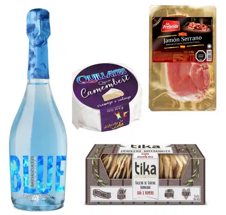 *Espumante Opera Prima Blue *Queso camembert 100 g *Jamón Serrano *Galletas Crackers Artesanales
