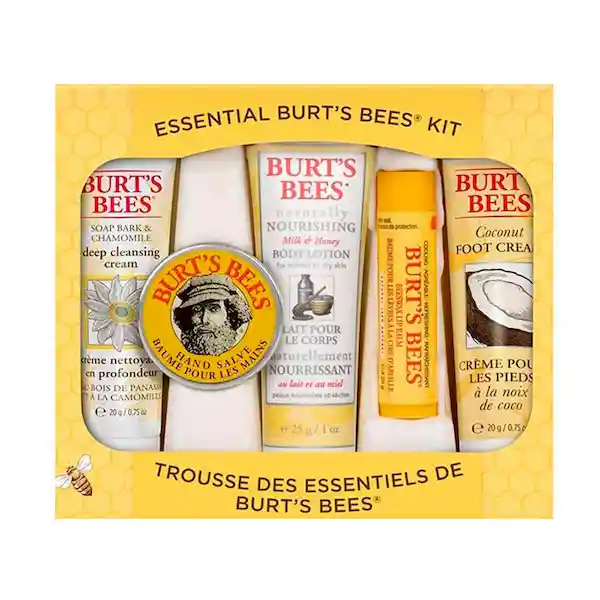 Kit burt's bees incluye 5 unidades: crema facial de limpieza profunda de palo de jabón y manzanilla 20 g + salva de manos 0.3 oz + loción corporal de leche y miel 25 g + onzas de bálsamo de labios de cera de abeja 4.25 g + crema de pies de coco 20 g. packing: Caja