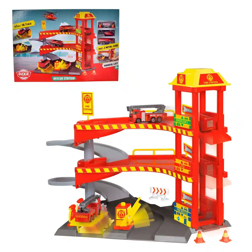 La Estación de Rescate Internacional de Dickie tiene todo lo que un garaje de estacionamiento moderno necesita, como un ascensor manual que sube y baja, tiene rampas, una estación de servicio y además una barrera para que solo los vehículos autorizados puedan ingresar. Tendrás más de un millón de posibilidades para que imagines y juegues durante interminables horas de diversión. Esta estación de rescate incluye también 2 vehículos diseñados con ruedas de acción libre para que puedas deslizarlos sobre cualquier superficie, así que no esperes más y deslízate hacia la diversión. Las medidas de la estación armada son 31 cm de alto y 41 cm de ancho.