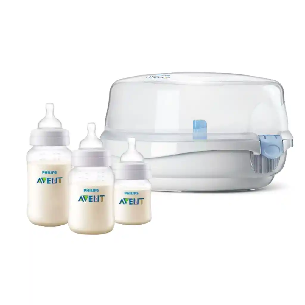 Contenido: • 1 Esterilizador a vapor para microondas Avent • 1 Set de Biberones de 125ml, 260ml, 330ml Esterilizador a vapor para microondas Avent El esterilizador a vapor para el microondas de Philips Avent es una excelente elección para esterilizar rápida y eficazmente dentro o fuera de casa. Se puede esterilizar hasta 4 mamaderas o productos Philips Avent de una vez y mata el 99,9% de los gérmenes en solo 2 minutos. Características: Elimina el 99.9% de gérmenes y bacterias. Está listo en tan sólo 2 minutos. El contenido permanece estéril por hasta 24 horas. El esterilizador esteriliza botellas con cuellos estándar y anchos. Se pueden esterilizar hasta 4 botellas de Philips Avent a la vez. Para usar dentro o fuera de la casa. Diseño ligero y compacto para las mamaderas esterilizadas vaya donde vaya. Apto para la mayoría de las microondas del mercado. Rápido esterilizador a vapor para microonda. Clips de seguridad para mantener el producto fresco y la tapa segura. Se adapta a varios tipos de mamaderas y a otros productos: Esteriliza extractores, chupetes, cubiertos y mamaderas. Set de 3 Biberones de 125ml, 260ml, 330ml Contenido: 1 Mamadera de 125 ML 1 Mamadera de 260ML 1 Mamadera de 330 ML ¡Un completo set pensado especialmente para reducir los dolorosos cólicos de tu bebé al momento de alimentarse! El Set mamadera anti-colic de Avent se ha diseñado especialmente para evitar que el aire entre en la barriguita de tu bebé, ¡reduciendo la posibilidad de dolorosos cólicos! Cuando tu bebé se alimenta, la válvula integrada en la tetina se flexiona con el fin de que el aire entre en la mamadera, evitando la acumulación de vacío, y dirige el aire hacia la parte posterior, manteniéndolo en la mamadera, ¡pero lejos del estómago de tu pequeño! Además, la forma de la tetina permite un enganche seguro y su textura acanalada ayuda a evitar que la tetina se colapse, logrando que la alimentación de tu bebé sea mucho más cómoda e ininterrumpida. Su diseño antigoteo es ideal para evitar el goteo durante la alimentación, entregándole a tu bebé una experiencia realmente agradable. Fácil de agarrar, fácil de limpiar, y reduce en 60% los malestares nocturnos de los más pequeños. Con mamaderas de diferentes tamaños, ¡este set es perfecto para tu bebé según sus necesidades! • Menos cólicos: Nuestra válvula anticólico está diseñada para mantener el aire lejos de la barriguita de su bebé para reducir los cólicos y el malestar. Mientras el bebé se alimenta, la válvula integrada en la tetina se flexiona para permitir que ingrese el aire en el biberón y llevarlo a su parte posterior para evitar la formación de vacío. Además, mantiene el aire en el biberón y lejos de la barriguita del bebé para ayudar a reducir los cólicos y el malestar. • Alimentación ininterrumpida: La forma de la tetina permite una sujeción segura y la textura acanalada ayuda a prevenir la contracción de la tetina para entregar una alimentación cómoda e ininterrupciones. • Fácil de limpiar: Con su cuello ancho y menos piezas, nuestro biberón es más fácil de armar y limpiar de forma rápida y minuciosa • Diseño antigoteo: Diseñamos nuestro biberón anticólico para evitar las filtraciones durante la alimentación y así disfrutar de una experiencia realmente agradable. • Sin BPA: El biberón anticólicos Philips Avent está fabricado con materiales sin BPA (PP). • Fácil de manejar: La exclusiva forma del biberón permite que sea fácil de sujetar y sostener en cualquier dirección. • Fácil de armar: Nuestro biberón anticólico tiene pocas piezas para armarlo de forma rápida y sencilla • Menos irritabilidad: El biberón anticólicos Philips Avent reduce el malestar. Los bebés alimentados con biberones anticólicos Philips Avent experimentaron un 60% menos de malestar por la noche, en comparación con aquellos alimentados con un biberón anticólicos de la competencia*. • Edad Recomendada: 0 Meses +