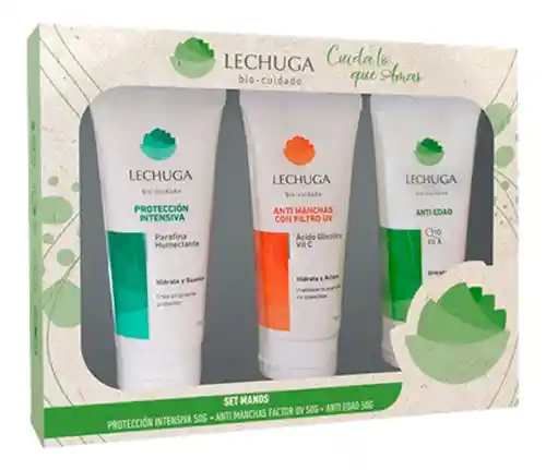 Contiene: 1 Protección intensiva 50g 1 Anti Manchas UV 50G 1 Anti Edad Factor 50G Protección intensiva: CREMA LECHUGA MANOS, NUTRICIÓN INTENSIVA. CUIDADO, HIDRATACIÓN, PIEL SECA, MUJERES CHILENAS, VITAMINA A, VITAMINA C, VITAMINA E, REPARACIÓN INTENSA, PIEL SUAVE, PIEL HIDRATADA, PROTECCIÓN, ELASTICIDAD, LUMINOSIDAD, ACLARANTE, HIDRATANTE, ÁCIDO GLICÓLICO, TEXTURA, TONALIDAD DE LA PIEL, CRUELTY FREE, PARAFINA, SUAVIZA Anti Manchas UV: CREMA LECHUGA MANOS FORMULA CON PROTECCIÓN MINERAL CON RAYOS UVB Y UVA. CUIDADO, HIDRATACIÓN, PIEL SECA, MUJERES CHILENAS, VITAMINA C, REPARACIÓN INTENSA, PIEL SUAVE, PIEL HIDRATADA, ELASTICIDAD, LUMINOSIDAD, ANTIMANCHAS, ACLARANTE, HIDRATANTE, ÁCIDO GLICÓLICO, TEXTURA, TONALIDAD DE LA PIEL, CRUELTY FREE, SUAVIZA Anti Edad Factor: CREMA LECHUGA MANOS REDUCE LOS SIGNOS DEL ENVEJECIMIENTO,HIDRATACIÓN, PIEL SECA, MUJERES CHILENAS, VITAMINA A, PIEL SUAVE, PIEL HIDRATADA, , ELASTICIDAD, LUMINOSIDAD, ACLARANTE, HIDRATANTE, ÁCIDO GLICÓLICO, TEXTURA, TONALIDAD DE LA PIEL, CRUELTY FREE, PARAFINA, SUAVIZA Set manos 50 gr Protección intensiva: FORMULADA CON EXTRACTOS DE LECHUGA, GLICERINA Y CERA DE PARAFINA QUE HIDRATA PROFUNDAMENTE LAS MANOS Y MEJORA EL ASPECTO DE LA PIEL SECA. Anti Manchas CON filtro UV: FORMULADA CON EXTRACTOS DE LECHUGA, VITAMINA C Y ÁCIDO GLICÓLICO; QUE HIDRATA LA PIEL ATENUANDO MANCHAS E IMPERFECCIONES. Anti Edad: FORMULADA CON EXTRACTO DE LECHUGA, VITAMINA A Y CO-ENZIMA Q10, QUE AYUDAN A PREVENIR Y REDUCIR LOS SIGNOS DEL ENVEJECIMIENTO