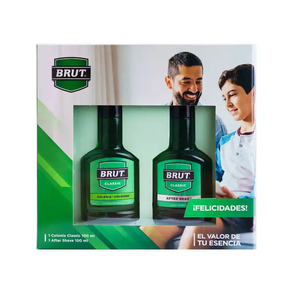 Estuche Brut que incluye una colonia Classic y una loción after shave de 100 ml cada una. Fragancia masculina clásica y duradera, ideal para el cuidado diario y después del afeitado.