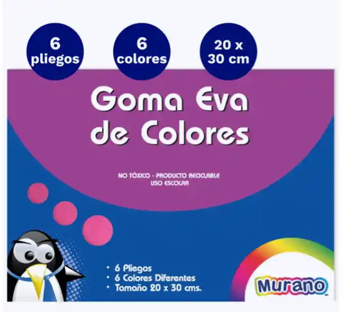 Estuche Goma Eva Murano contiene 6 unidades - 6 colores, medidas 20x30 cms aproximadamente