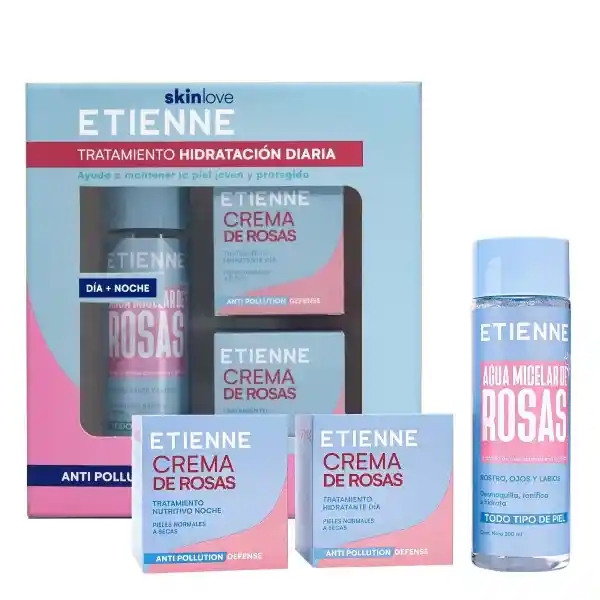 Kit Etienne Contiene 3 Unidades. Crema Rosas Dia 50 mL + Crema Rosas Noche 50 mL + Agua Micelar de Rosas 1 Und. Tratamiento y Limpieza Rosas. Crema y Agua Micelar.