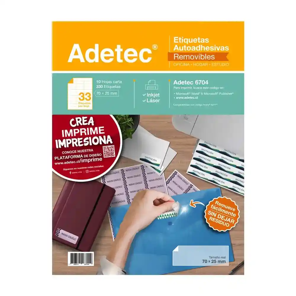Tipo de impresión: (Papel apto para impresoras inkjet y láser). Cantidad: 10 hojas. Gramaje: 150 gr. Formato: Carta. Dimensiones: 70X25 mm, en hojas formato carta aptas para impresora INKJET Y LÁSER. Las etiquetas NO dejan residuos al momento de retirarlas.