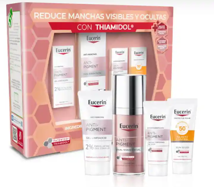 EUCERIN Pack Rutina Antipigment Antimanchas Mini X3 137 mL es una rutina intensiva diseñada para reducir manchas visibles y ocultas, ayudando a prevenir su reaparición con el uso regular. Incluye Sérum Dual, Crema de Día FPS30, Crema de Noche y un protector solar miniatura FPS50+ para una protección completa. Sus fórmulas con Thiamidol® actúan en la raíz de la hiperpigmentación, logrando una piel más uniforme y luminosa. ■ Beneficios y características Sérum Dual con Thiamidol® que reduce manchas desde la raíz. Crema de Día FPS30 que protege contra rayos UV y previene nuevas manchas. Crema de Noche que regenera la piel mientras duermes. Protector Solar Mini FPS50+ para alta protección diaria. ■ Ingredientes principales Thiamidol®: actúa sobre la hiperpigmentación. Ácido Hialurónico: hidrata y mejora la elasticidad. Filtros solares FPS30 y FPS50+: protegen contra rayos UV. ■ Modo de uso Limpia el rostro antes de aplicar los productos. Aplica el Sérum Dual mañana y noche, evitando el contorno de ojos. Usa la Crema de Día FPS30 en la rutina de mañana y la Crema de Noche antes de dormir. Complementa con el protector solar FPS50+ en exposición prolongada. ■ Advertencias y uso responsable Uso externo. Evitar contacto con ojos y mucosas. En caso de irritación, suspender su uso y consultar a un especialista. Mantener fuera del alcance de los niños y conservar en lugar fresco y seco. ■ ¿Para quién es? Personas con manchas visibles o tendencia a hiperpigmentación. Quienes buscan una rutina completa para unificar el tono de la piel. Usuarios que desean protección solar y cuidado intensivo. Ideal para pieles que requieren prevención y tratamiento antimanchas