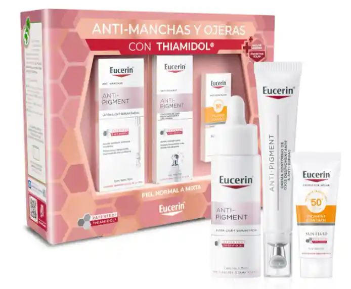 EUCERIN Pack Rutina Antipigment Ojeras 95 mL es una rutina focalizada para reducir manchas y oscurecimiento en la zona del contorno de ojos. Incluye Sérum, Contorno de Ojos y Protector Solar FPS50+ para un cuidado completo. Sus fórmulas con Thiamidol® actúan en la raíz de la hiperpigmentación, ayudando a unificar el tono y prevenir nuevas manchas, dejando la piel más luminosa y uniforme. ■ Beneficios y características Sérum que reduce manchas y mejora la uniformidad del tono. Contorno de ojos que disminuye ojeras oscuras y signos de fatiga. Protector Solar FPS50+ que protege la zona delicada contra rayos UV. Fórmulas ligeras y de rápida absorción, aptas para uso diario. ■ Ingredientes principales Thiamidol®: actúa sobre la hiperpigmentación. Ácido Hialurónico: hidrata y mejora la elasticidad. Filtros solares FPS50+: protección contra rayos UV. ■ Modo de uso Limpia el rostro antes de aplicar los productos. Aplica el Sérum en el rostro evitando el contorno de ojos. Usa el Contorno de Ojos con suaves toques en la zona periocular. Finaliza con el protector solar FPS50+ en la rutina de día. ■ Advertencias y uso responsable Uso externo. Evitar contacto directo con los ojos. En caso de irritación, suspender su uso y consultar a un especialista. Mantener fuera del alcance de los niños y conservar en lugar fresco y seco. ■ ¿Para quién es? Personas con manchas y oscurecimiento en el contorno de ojos. Quienes buscan unificar el tono y reducir signos de fatiga. Usuarios que desean protección solar en la zona periocular. Ideal para rutinas antimanchas focalizadas