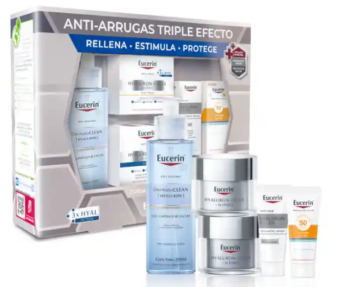 EUCERIN Pack Rutina Hyaluron Filler Antiarrugas 287 mL es una rutina completa para los primeros signos de envejecimiento. Incluye gel de limpieza, sérum, crema de día FPS30 y protector solar mini FPS50+ para hidratar, rellenar arrugas y proteger la piel. Sus fórmulas con Ácido Hialurónico ayudan a mantener la piel fresca, suave y visiblemente rejuvenecida. ■ Beneficios y características Gel de limpieza que elimina impurezas y maquillaje sin resecar. Sérum con Ácido Hialurónico para hidratación intensiva. Crema de Día FPS30 que protege contra el fotoenvejecimiento. Protector Solar Mini FPS50+ para refuerzo de protección UV. ■ Ingredientes principales Ácido Hialurónico: hidrata y rellena arrugas. Filtros solares FPS30 y FPS50+: protegen contra rayos UV. Glicerina: ayuda a mantener la hidratación natural. ■ Modo de uso Limpia el rostro con el gel antes de aplicar otros productos. Aplica el sérum mañana y noche sobre la piel limpia. Usa la crema de día FPS30 en la rutina matutina. Refuerza la protección con el protector solar FPS50+ en exposición prolongada. ■ Advertencias y uso responsable Uso externo. Evitar contacto con ojos y mucosas. En caso de irritación, suspender su uso y consultar a un especialista. Mantener fuera del alcance de los niños y conservar en lugar fresco y seco. ■ ¿Para quién es? Personas que presentan los primeros signos de envejecimiento. Quienes buscan hidratación profunda y protección solar diaria. Usuarios que desean una rutina completa antiarrugas. Ideal para pieles que requieren prevención y cuidado intensivo.