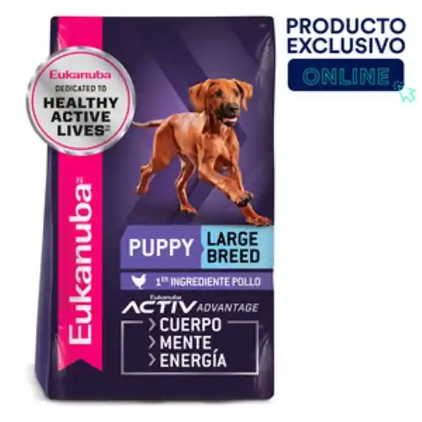 El Alimento Seco Para Perros Eukanuba Puppy Large Breed Proporciona Una Nutrición Completa y Equilibrada Que Mantiene su Cuerpo y Mente Nutridos y en Desarrollo Constante. Este Alimento Para Cachorros de Razas Grandes Está Elaborado Con Proteínas Animales de Alta Calidad Niveles Óptimos de Calcio Fósforo Grasas y Carbohidratos Que Han Sido Optimizados Para Que Crezca Grande y Fuerte. AdeMás la Fibra Natural y Los Prebióticos Ayudan a la Correcta Digestión y la Vitamina e y el Dha Apoya el Desarrollo Del Sistema Inmunológico y Cerebral. Empiece Con su Mejor Amigo en el Camino Hacia la Salud y la Felicidad Con un Alimento Diseñado Especialmente Para Sus Necesidades de Raza Grande. Beneficios: Proporciona Una Nutrición Completa y Equilibrada Para Cachorros de Razas Grandes y Gigantes de Entre 2 y 15 Meses de Edad y Que Pesan Más de 25 Kg. Contiene Niveles Elevados de Dha Que Mantienen Una Función Cerebral Saludable Para su Cachorro de Raza Grande o Gigante Para un Cachorro Más Entrenable. Contenido Óptimo de Grasas y Carbohidratos Adecuado Específicamente Para Los Cachorros en Crecimiento. Mantiene Los Dientes Limpios y Las Encías Saludables Con su Tecnología Eukanuba 3D Dentadefense Que Reduce la Formación de Sarro. Apoya el Excelente Crecimiento Óseo y Muscular Con Los Niveles Adecuados de Proteína Animal Calcio y Fósforo.