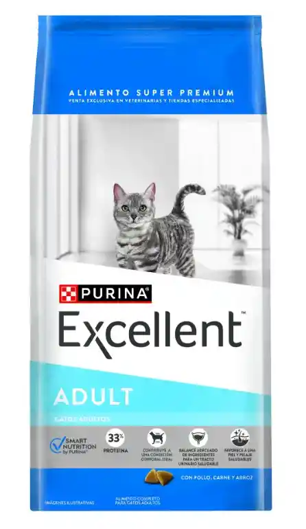 Excellent Gato adulto pollo carne y arroz 3Kg Descripción PURINA® Excellent® Adulto Pollo y Arroz, ofrece una fórmula con una óptima combinación de ingredientes, proteínas de alta digestibilidad y ácidos grasos omega 3 y 6, para mantener al máximo la salud del gato adulto. Características: CONDICIÓN CORPORAL IDEAL La utilización de fuentes de proteínas de elevada digestibilidad garantiza el aporte de aminoácidos esenciales que ayudan a mantener músculos fuertes y sanos. Así́, cualquiera sea el nivel de actividad física de tu gato, puedes estar seguro de que sus necesidades proteicas estarán satisfechas. TRACTO URINARIO SALUDABLE Una óptima combinación de ingredientes ayuda a mantener un pH adecuado en la orina, el cual contribuye a la reducción de la formación de cálculos y cristales, colaborando con el mantenimiento de un tracto urinario saludable, fundamental para la salud de tu gato. PIEL SANA Y PELAJE BRILLANTE La combinación de los ácidos grasos Omega 6 y 3 junto a vitaminas y minerales favorecen la salud de la piel y un pelaje brillante, primera señal de una salud general adecuada.