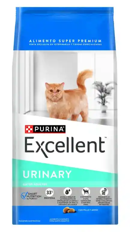 Excellent Gato Urinario pollo carne y arroz 1Kg Purina Excellent Urinary es un alimento especialmente formulado para gatos adultos que ayuda a mantener un tracto urinario saludable, reduciendo la formación de cristales y cálculos, gracias a una combinación de ingredientes que promueve un pH urinario adecuado y una mayor ingesta de agua. Beneficios clave: Reducción de cristales y cálculos: La fórmula ayuda a disminuir la formación de cristales y cálculos en la orina, lo que contribuye a la salud del tracto urinario. pH urinario adecuado: Contiene ingredientes que ayudan a mantener un pH urinario ligeramente ácido, lo que dificulta la formación de cristales de estruvita. Mayor ingesta de agua: El adecuado nivel de sodio en la fórmula ayuda a aumentar la ingesta de agua, lo que diluye la orina y ayuda a prevenir la formación de cristales. Proteínas de alta digestibilidad: Contiene proteínas de alta calidad y digestibilidad, lo que asegura una óptima absorción de nutrientes y mantiene la salud muscular. Fórmula completa y balanceada: La fórmula está diseñada para cubrir las necesidades nutricionales específicas de los gatos adultos, sin colorantes ni saborizantes artificiales. Ingredientes: Gluten de maíz, maíz, trigo, harina de subproductos de pollo, arroz, grasa vacuna y/o aceite de pollo, harina de carne y hueso vacuna, sal, digesto animal, ácido fosfórico y/o bisulfato de sodio, harina de pescado, cloruro de potasio, carbonato de calcio y/o fosfato cálcico, L-lisina, suplementos vitamínicos y minerales, levadura seca, taurina, DL-metionina, BHT.