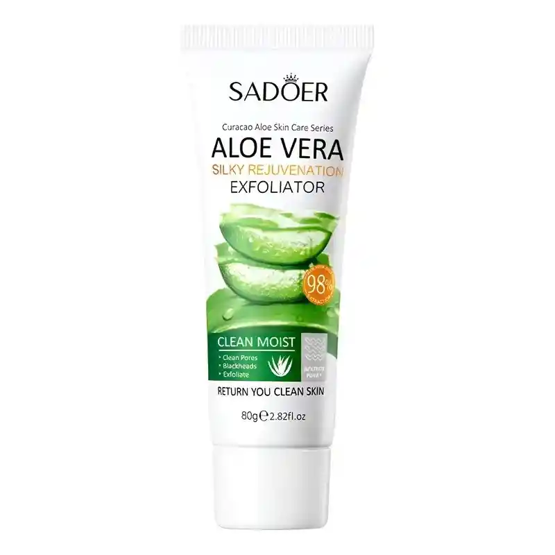 Sadoer Aloe Vera Silky Rejuvenation Exfoliator – Exfoliante facial con extracto de aloe vera que ayuda a eliminar células muertas, impurezas y exceso de grasa, dejando la piel limpia, suave y renovada. Su fórmula contribuye a limpiar los poros, mejorar la textura del rostro y aportar una sensación de frescura e hidratación sin resecar. Ideal para complementar la rutina de cuidado facial y mantener una piel más uniforme y luminosa. Contenido: 80 g. Uso externo.