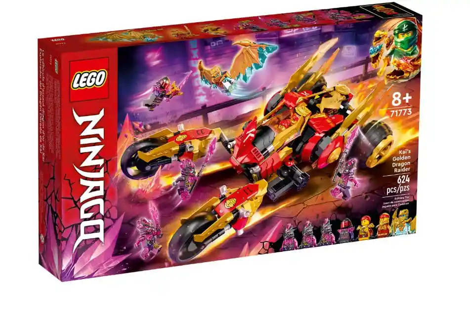 Los fans de los ninja de 8 años o más podrán recrear la trepidante acción de la serie para televisión NINJAGO®: Crystallized con el alucinante set Explorador del Dragón Dorado de Kai (71773). Contiene un vehículo todoterreno con cabina, 2 cañones con 4 disparadores y espadas del Dragón Dorado. Al plegar las ruedas traseras del Explorador, cambia del modo carretera al modo caminante y se mueve como una criatura. Un set de construcción que entusiasmará a los fans de los ninja Este set de construcción incluye 7 minifiguras: Kai Dorado, Zane Dragón Dorado con alas del Dragón Dorado, su aliada Skylor y los villanos General Señor F, un bruto Vengarroca y 2 guerreros Vengarroca que los peques enfrentarán cara a cara. ¡Juguetes geniales para transportar a los niños a un mundo de fantasía! Los juguetes NINJAGO animan a los peques a dejar a un lado las pantallas y sumergirse en un absorbente mundo de acción habitado por valientes héroes ninja y repleto de mecas, vehículos, dragones y templos. • Set NINJAGO® con un vehículo: Los fans de los ninja podrán dar vida a sus escenas favoritas de la serie para televisión NINJAGO: Crystallized con el set LEGO® NINJAGO Explorador del Dragón Dorado de Kai (71773). • 7 minifiguras: Incluye a Kai Dorado, Zane Dragón Dorado, Skylor, el General Señor F, un bruto Vengarroca y 2 guerreros Vengarroca que los niños usarán para interpretar épicas batallas en la ciudad de NINJAGO® • Vehículo todoterreno de juguete: Este coche de estilo buggy cuenta con cabina, 2 cañones con 4 disparadores y espadas del Dragón Dorado. Al cambiarlo del modo carretera al modo caminante se mueve como una criatura. • Más acción ninja: Hay otros 7 juguetes basados en la serie para televisión NINJAGO®: Crystallized. No te pierdas, por ejemplo, los sets Todoterreno del Dragón de Cole (71769), Reactor del Dragón Dorado de Zane (71770) y Rey Cristal (71772). • Regalo para fans de los ninja: Este set de construcción de 624 piezas es una idea de regalo fantástica para peques a partir de 8 años que disfrutan creando modelos LEGO® y representando batallas. • Un decorativo modelo: El Explorador del Dragón Dorado de Kai, que mide aproximadamente 13 cm de altura, 35 cm de longitud y 19 cm de anchura, puede exponerse con orgullo hasta la siguiente sesión de juego. • Acción y fantasía: Los juguetes LEGO® NINJAGO® animan a los niños a dejar a un lado las pantallas y adentrarse en un mundo mítico donde podrán imaginar que son héroes ninja. • Alta calidad: Desde hace más de 6 décadas, nuestros ladrillos LEGO® se fabrican con la total garantía de que van a separarse sin dificultad una y otra vez. ¡No necesitarás tener la fuerza de los ninja!. • Siempre estarás en buenas manos: Los ladrillos para construir LEGO® satisfacen estrictos estándares mundiales de seguridad.