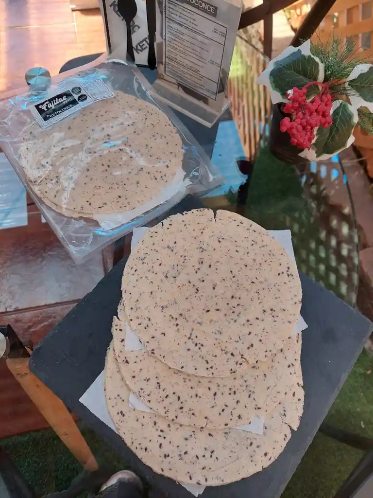 Fajitas keto artesanales, elaboradas con harina de coco, linaza, goma guar y huevo. Perfectas para un estilo de vida bajo en carbohidratos, suaves y llenas de sabor. Una opción saludable y deliciosa para tus comidas