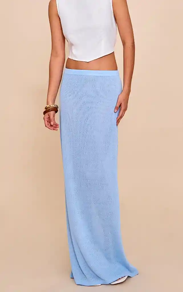 Falda Maxi Azul Tejida Texturizada Dile adiós a las dudas sobre qué ponerte con esta falda maxi azul cielo de tejido texturizado. Con un diseño largo y elegante, esta prenda aporta un toque sofisticado y moderno a cualquier look. Perfecta para combinar con un top corto y tacones, logrando un estilo chic y femenino ideal para esta temporada y más allá. Descripción del producto: La Falda Maxi Azul Tejida Texturizada es una pieza versátil que combina comodidad y estilo. Su tejido con efecto texturizado y su largo elegante estilizan la silueta, ofreciendo una caída fluida y favorecedora. Ideal para ocasiones casuales o semi formales, se adapta fácilmente tanto a looks de día como de noche. Atributos técnicos: Color: azul cielo Material: tejido con textura tipo punto Largo: maxi Ajuste: recto y fluido Cintura: elástica Temporada: primavera-verano Uso: casual, evento, salida