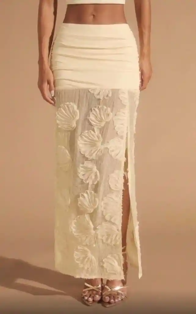 Falda Maxi Transparencias Shell Beige Eleva tu estilo primavera–verano con esta falda maxi beige con transparencias y detalles de shells en relieve. Su diseño etéreo y femenino destaca por una sutil apertura lateral que aporta movimiento, frescura y un toque sensual sin perder elegancia. Perfecta para combinar con el top a juego o con prendas neutras para un look playero, romántico y veraniego. Descripción del producto: La Falda Maxi Transparencias Shell Beige es una prenda ligera y sofisticada confeccionada en una tela translúcida con bordados de conchas marinas. Su caída suave y su abertura lateral estilizan la figura, mientras la textura elevada crea un efecto visual único. Ideal para eventos de día, salidas estivales o como conjunto coordinado para un estilo inspirado en el mar. Atributos técnicos: Color: beige Material: malla semi–transparente con relieve bordado Diseño: shells en relieve / textura marina Largo: maxi Corte: recto con apertura lateral Cintura: elasticada Estilo: romántico / playero / primaveral–veraniego Temporada: primavera – verano Uso: casual elegante, playa, eventos de día