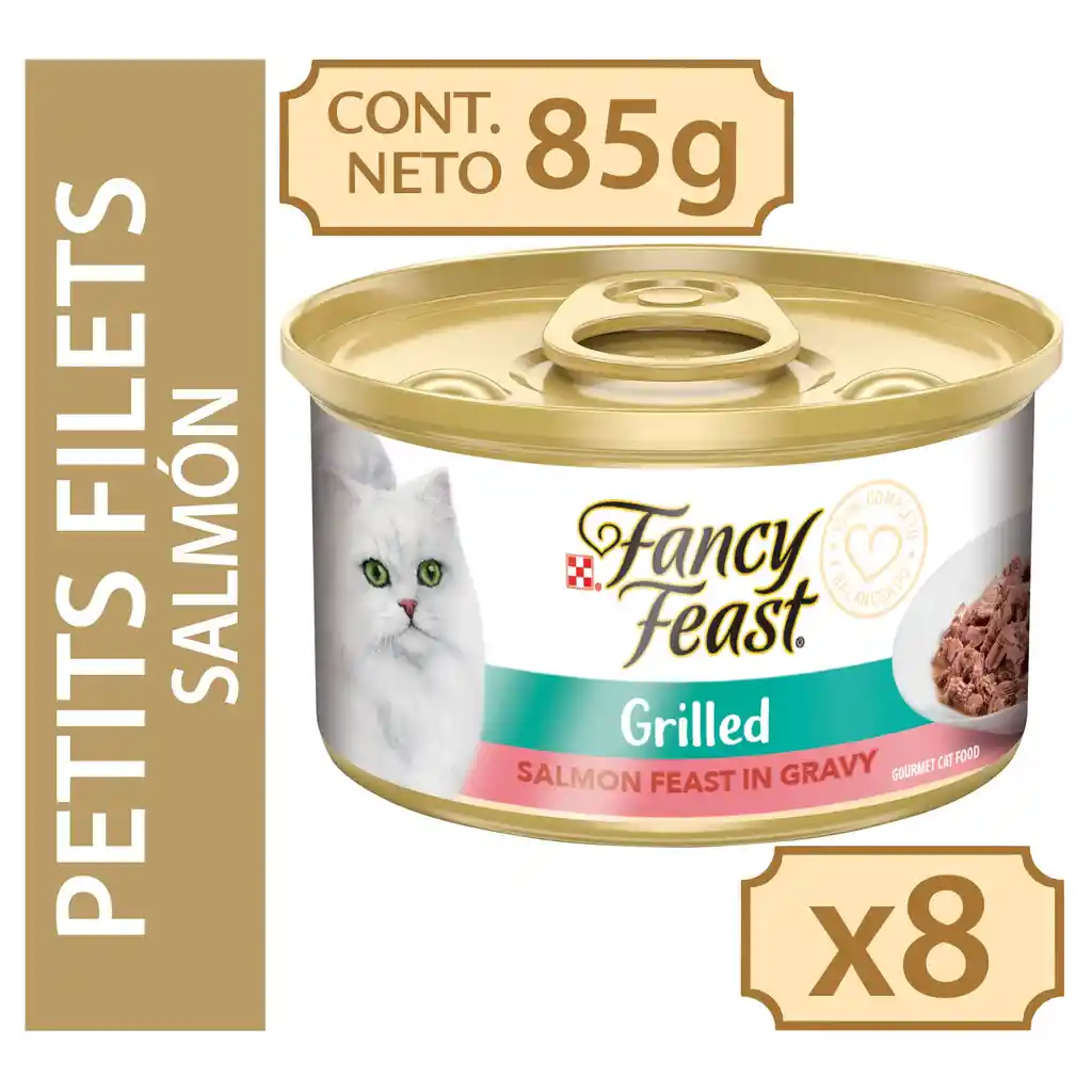 Fancy Feast mini filetes con salmón, es un suculento festín de salmón cocinado a fuego lento. Posee un sabor único y superior, con texturas que crean una experiencia culinaria.