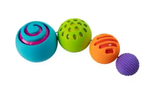 Conjunto de bolas texturizadas y atadas que se abren y se anidan una dentro de la otra. Cada bola colorida tiene una textura única con puntos, líneas y remolinos fascinantes. Fomenta la exploración sensorial, el aprendizaje táctil, las habilidades motoras finas, la permanencia de los objetos y el razonamiento espacial. Una experiencia de aprendizaje temprana ingeniosamente innovadora. Set de 4 esferas. Fabricados materiales altamente resistente, libre de BPA, son fáciles de limpiar. Edad Recomendada +10 meses