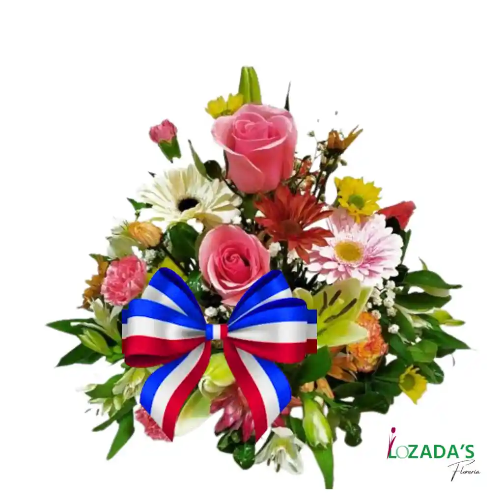 Acompaña a tus familiares y amigos haciéndote presente con este centro de flores primaverales con lazo en tonos de nuestra bandera.. Diseño de flores perfectas para enviar cariño y buenos deseos, este arreglo floral destaca por sus colores vivos y frescura. Contienes flores en tonos primaverales de temporada: rosas, girasoles, margaritas, liliums y según disponibilidad, con un lazo con los colores de nuestra bandera para hacerte notar en estas fechas patrias. ¡Viva Chile!