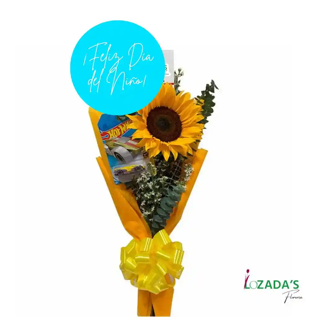 Sorprende a los más pequeños de la casa con este regalo súper especial de un girasol y un auto Hot Wheels.