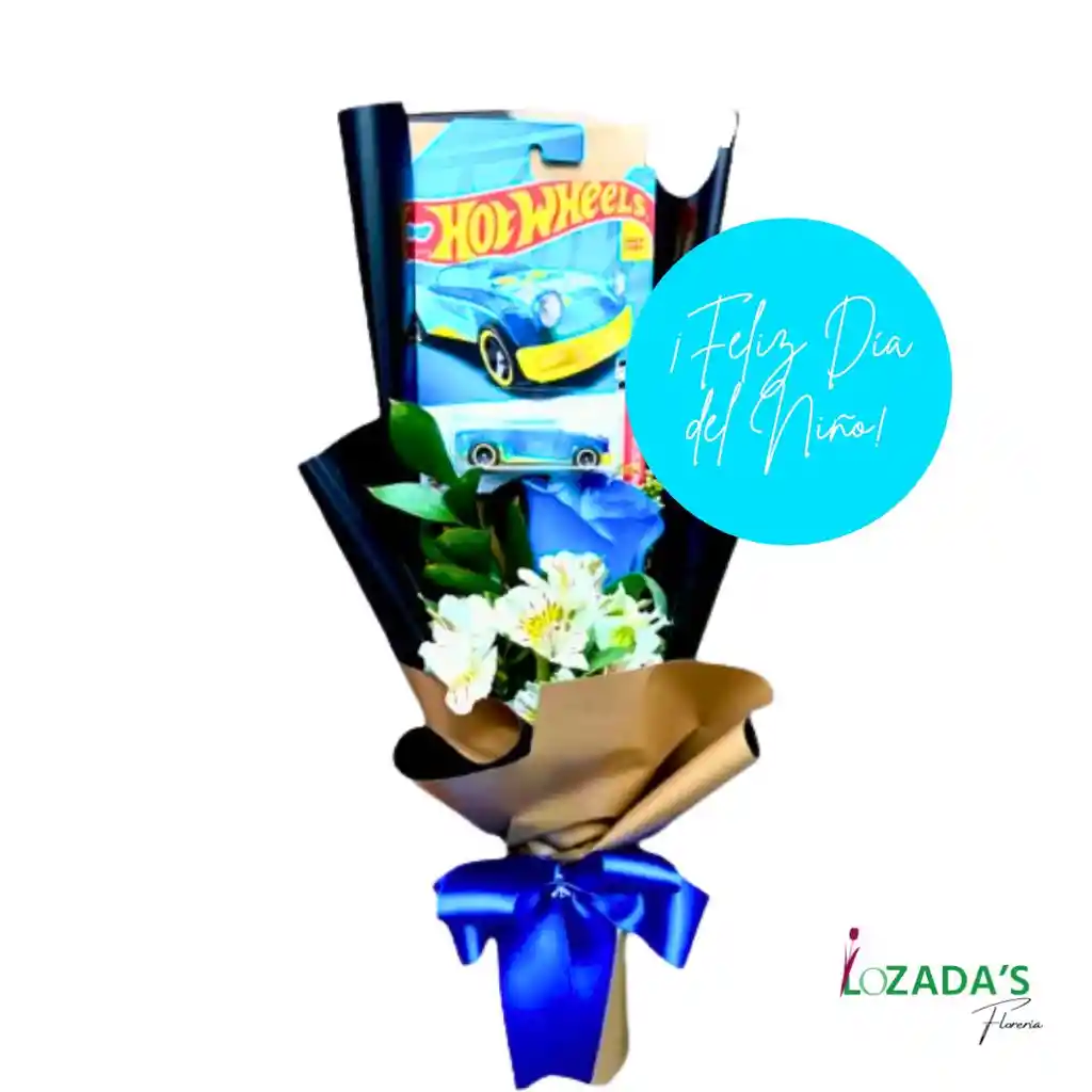 Celebra a los mas pequeños de la casa con este Arreglo especial de una Rosa azul más un auto Hot Wheels