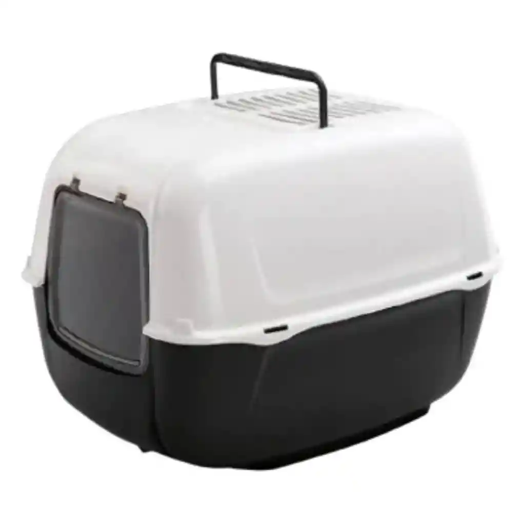 Se trata de un práctico arenero para gatos, cubierta de plástico para asegurar la máxima privacidad. Viene con asa para moverla donde quieras, doble filtro de carbón que neutraliza los malos olores. Medidas: 52,5 x 39,5 x 38 cm. Consta de dos cubiertas principales de plástico (superior e inferior) que están sujetas por cuatro acoples a presión. Además, tiene rejillas de ventilación en la parte superior, y entrada con puerta vaivén para que el acceso sea rápido. Sus esquinas redondeadas ofrecen mayor amplitud en el interior. Producto Italiano