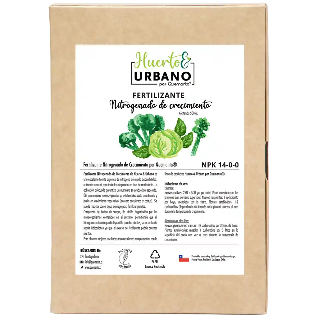 Este Fertilizante Nitrogenado de Crecimiento de Huerto y Urbano, es una excelente fuente orgánica de nitrógeno de rápida disponibilidad, nutriente esencial para todo tipo de plantas en fase de crecimiento. La aplicación adecuada garantiza un aumento en producción esperada. Útil para mejorar suelos y plantas ya establecidas. Apto para huerto y jardín en crecimiento vegetativo (excepto suculentas y cactus). Se puede mezclar con el agua de riego para fertilizar plantas.Compuesto de harina de sangre de rápida degradación por los microorganismos contenidos en el sustrato, permitiendo que el Nitrógeno contenido quede disponible para las plantas, se recomienda seguir indicaciones ya que el exceso de fertilizante podría quemar plantas.Características Específicas: * Contiene 500gr * Eco friendly _Quemanta es una empresa dedicada a la elaboración de fertilizantes, enfocada a presentar una alternativa nacional de alta calidad, haciendo énfasis en la búsqueda de mejorar y facilitar el proceso de nutrición de tus plantas, para que éstas crezcan grandes, fuertes y saludables._