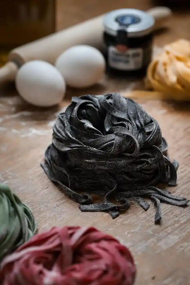 Cintas de pasta artesanal con tinta de calamar. 2 porciones por Pack ( 4 nidos ) Modo de Cocción: Colocar la pasta en una olla con abundante agua hirviendo con sal a gusto. Revolver con tenedor y esperar 1.30 min a 2 min app .Colar y servir. Ideal para servir con Salsas que contengan mariscos o pescados.