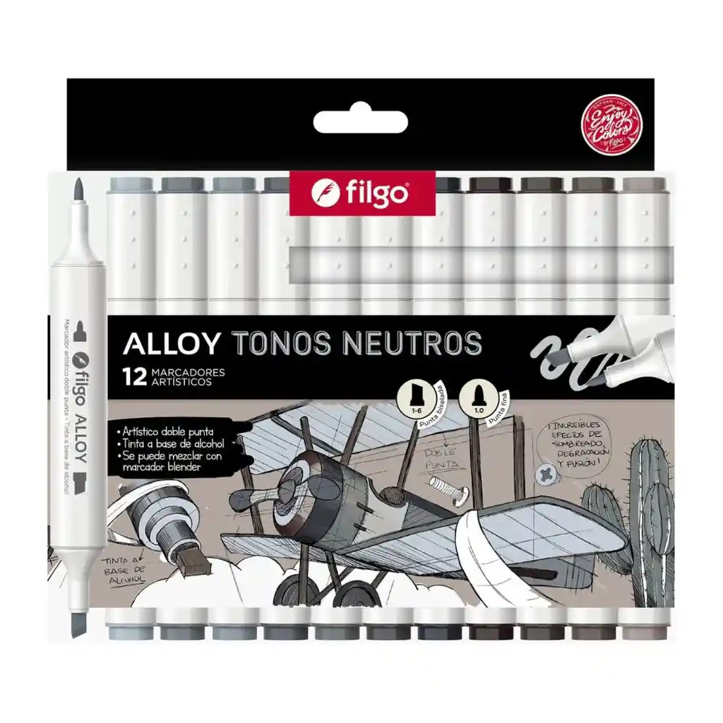 Los Marcadores al Alcohol Alloy de la marca Filgo te permiten crear variados estilos artísticos, gracias a su doble punta: Biselada para trazos gruesos y rellenos, y Redonda para hacer detalles. Cuentan con tinta a base de alcohol, altamente pigmentada y de secado rápido, que puede mezclarse con blender. Sus tapas herméticas evitan la volatilización o secado de la tinta. Se recomienda usar papel a partir de 90 g/m2 para evitar manchado o traspaso de la tinta. Ideales para ilustración, bocetos, diseño y otras creaciones artísticas. Los Marcadores Filgo en su línea Alloy se encuentran disponibles en 6 sets diferentes. El Set de Tonos Grises Neutros contiene los siguientes colores: Hielo, Gris Perla, Perla, Aluminio, Gris Oscuro, Cemento, Hierro, Grafito, Tierra, Sepia, Visón y Arena. 12 unidades. Tapas herméticas. Tinta a base de alcohol. Usos: ilustración, bocetos, diseño. Punta biselada (1-6 mm) y redonda (1.0 mm).