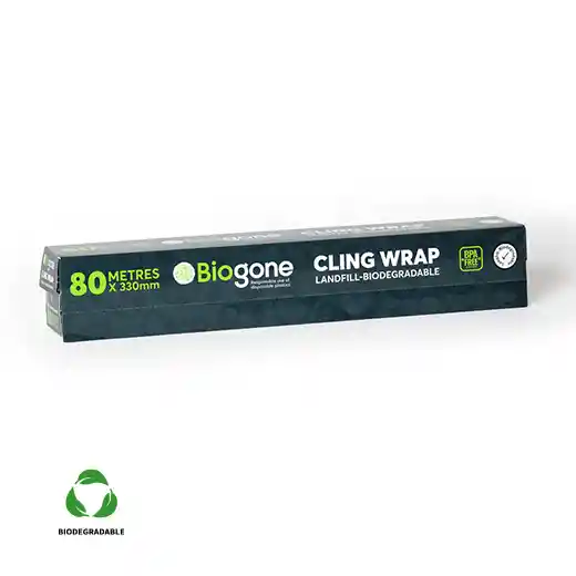 No desperdiciar alimentos es una gran forma de ayudar al planeta, el contar con productos que nos ayudan a conservarlos de forma adecuada es muy útil para esto y que mejor si no generan desechos en el proceso. El film de cocina Biogone de 80 mts. es libre de BPA por lo que está indicado para cubrir tus alimentos sin riesgos para tu salud.Los productos Biogone se biodegradan un 95% más rápido que las convencionales, por lo que son mucho más amigables con el medioambiente.Características: * 80 o 600 metros por rollo * Ancho 33 cms o 45 cms * Cuchillo de corte incorporado * Densidad: 10 micrones * No tiene olor * Producto landfill biodegradable Biogone * Color: transparente * Reciclable * Apto para microondas y para freezer