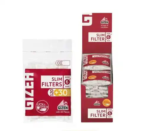 Filtro Gizeh Slim Rojo con pegamento bolsitas de 120 filtros + 30 Gratis (promoción hasta agotar stock) Filtros Slim de 6 mm de diámetro y 15 mm de largo Con pegamento para adherirse al papel