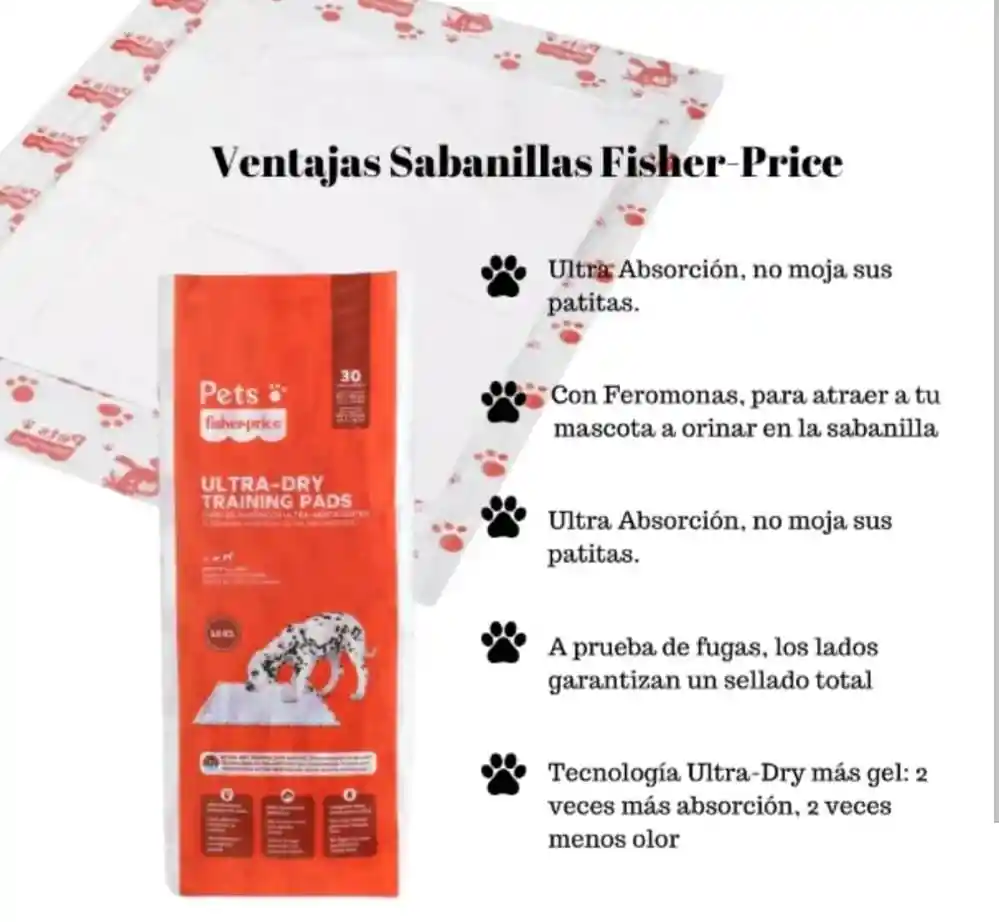 En Punto Mascotas nos preocupamos por el bienestar de tus mascotas. Presentamos los Tapetes Higiénicos Fisher Price con tecnología Ultra Absorbente, diseñados para mantener las patitas secas y evitar derrames laterales, junto con un secado rápido que elimina olores. Nuestra solución: ¡la orina en el lugar adecuado! Tanto tú como tu mascota estarán encantados con la limpieza y comodidad que brindan estos tapetes. ¡Fisher-Price ahora también es para mascotas!