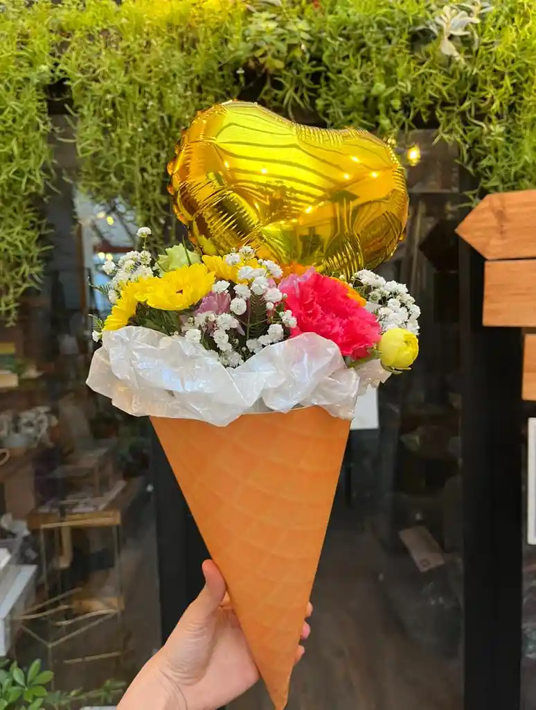 Nuestro Flor-helado es la sorpresa perfecta para los más pequeños, un detalle único y lleno de color que combina la belleza de las flores con la dulzura de los chocolates. Este original regalo viene en un cono con diseño de helado, coronado por un vibrante y alegre mix de flores de temporada y un globo mediano en forma de corazón. Pero la verdadera sorpresa está en su interior: al abrirlo, encontrarán escondidos 8 deliciosos bombones Rafaello y 3 irresistibles bombones Valente, ¡un tesoro de dulzura que los dejará con una sonrisa! Es el regalo ideal para despertar la imaginación y llevar alegría. ¡No es un helado, es mucho mejor! Incluye: Cono de cartón con diseño de helado Mix de flores coloridas Globo mediano con forma de corazón 8 bombones Raffaello 3 bombones Valente